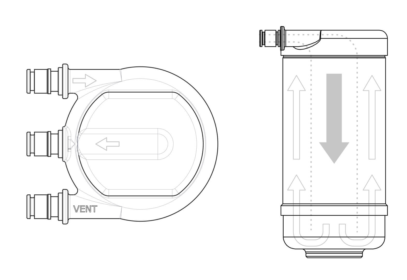 Der SKS-Filter verbessert die Strömungsgeometrie herkömmlicher „T-Line“- oder „In-Line“-Konfigurationen zu einer „E-Konfiguration“. Die E-Konfiguration ermöglicht eine kompakte Bauweise und somit wertvolle Platzersparnisse bei der Konstruktion.