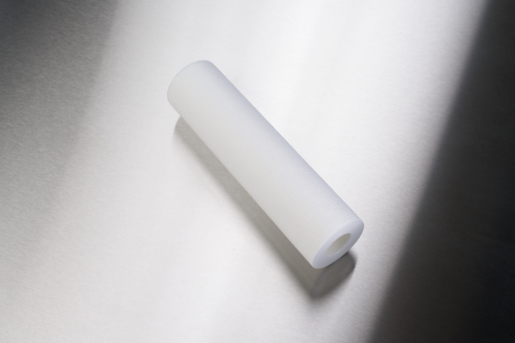 Eine Tiefenfilterkerzen mit Bikomponentenfasern PP/PE, bei denen die Fasern aus Polypropylen von einer Außenhülle aus Polyethylen umgeben sind.